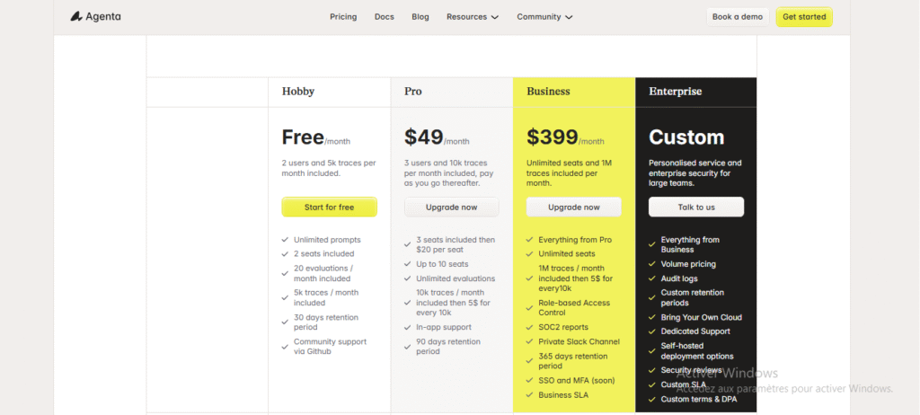 - The free / Hobby tier lets you get started with 2 users, 5,000 traces per month, basic prompt management, and up to 20 evaluations/month. Retention period is limited, and support is community-based.