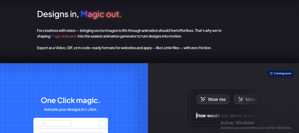 Magic Animator is a cloud-based, AI-powered animation generator that lets users animate static designs with minimal effort. According to its official site, you can “Animate your designs in 1-click” (on the site) and “Generate animations” from your static visuals.