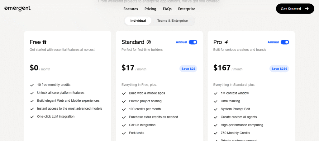 Emergent.sh uses a credit-based model: each build or deployment consumes credits. The free tier gives limited credits; paid plans give monthly credits. Heavy use or iterations may require more credits or higher plan.