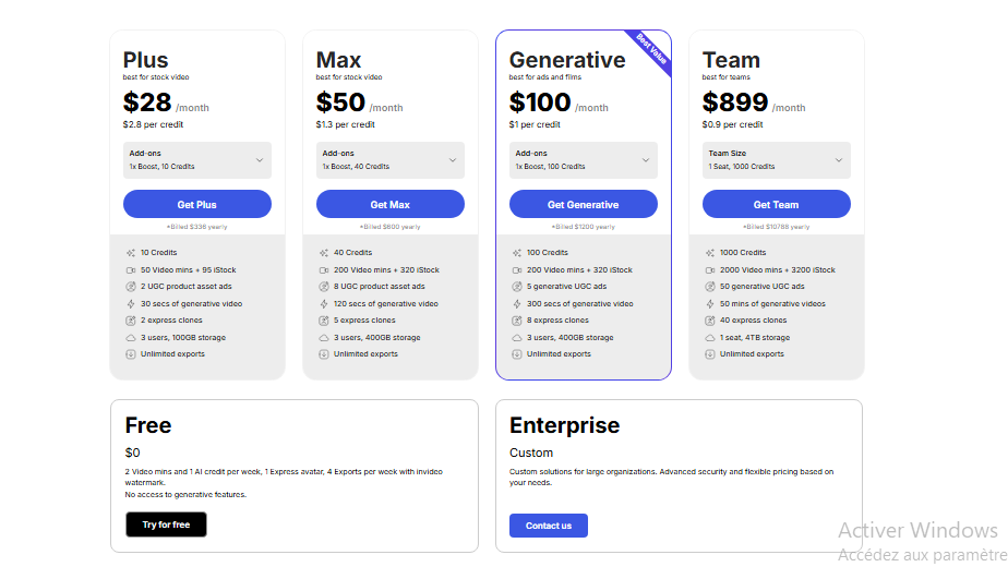 - Unlimited / Agency plans: For heavier usage / agencies needing many videos, higher tiers. Also there are add-ons for AI minutes, voice-clone.