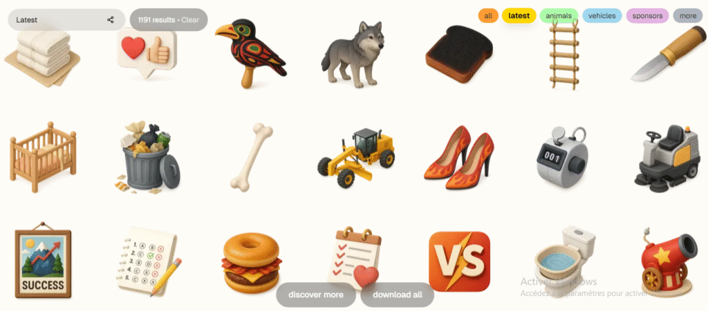 - Massive library of 3D-style icons, many with transparent backgrounds