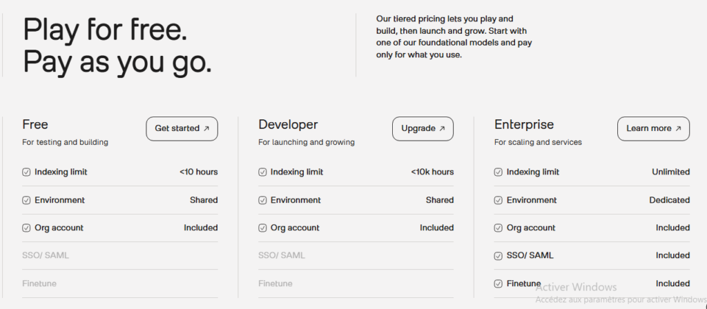 - Enterprise Plan: For large-scale usage — unlimited hours, dedicated environment, enterprise security, fine-tuning capabilities, SSO/SAML and more.